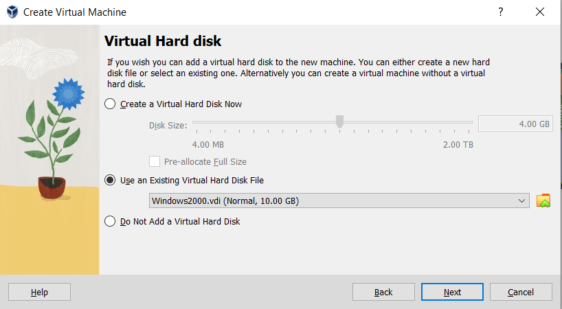 - when it gets to the screen that says ‘Virtual Hard Disk’, select ‘Use an existing hard disk file’ select the windows 2000 . vdi file that you extracted and put somewhere safe earlier.