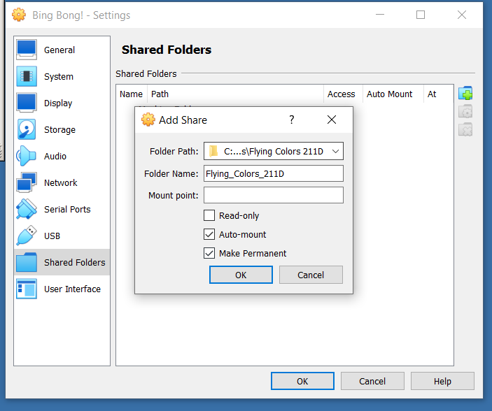 - Add a new folder, select the folder path of the Flying Colors exe file and the art packs on your computer, and make sure you select “Auto-Mount” (this will make it show up in “My Computer”) and “Make Permanent” (this will make it be there when you close the Virtual Machine and boot it back up)